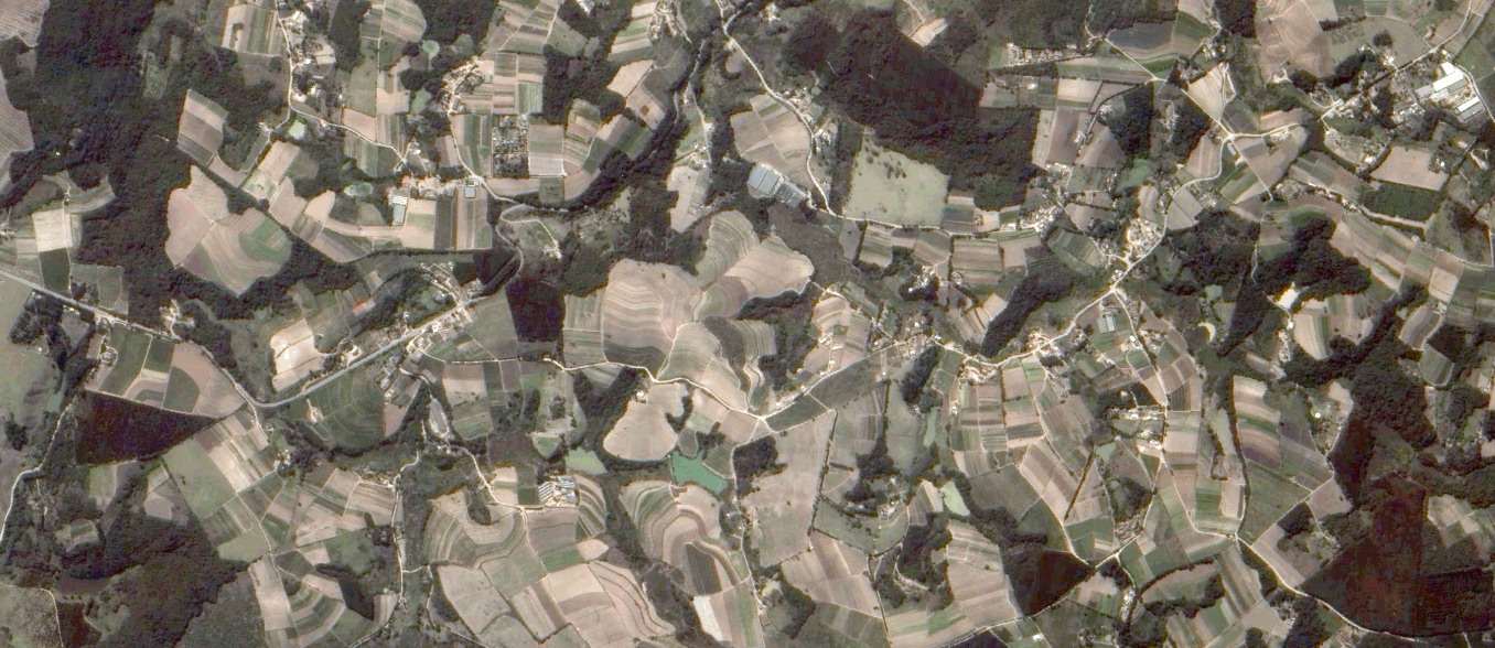 Pancromático P&B; Multiespectral: Azul, Verde, Vermelho e Infravermelho próximo. Elaboração por processamento da fusão PSM de 2,0 m colorido e 4 bandas espectrais.