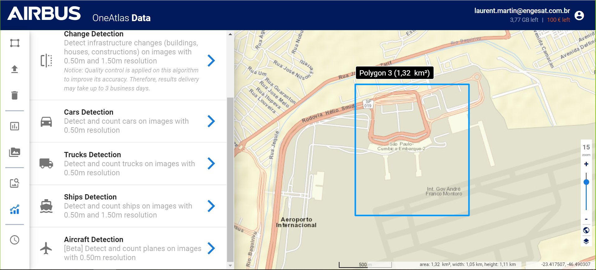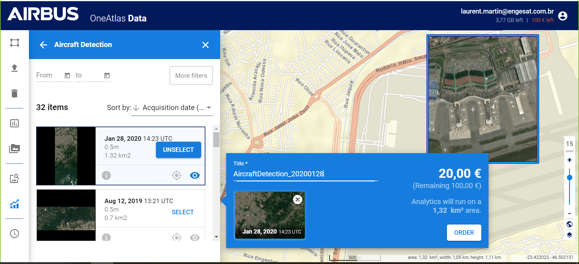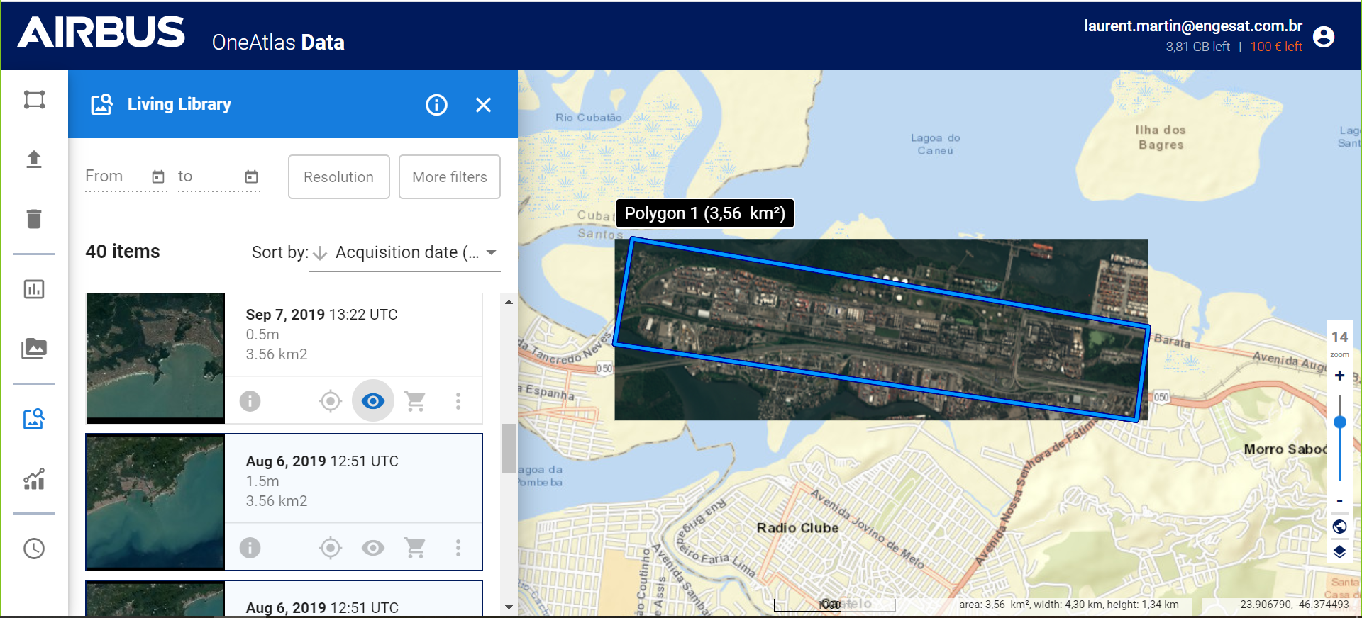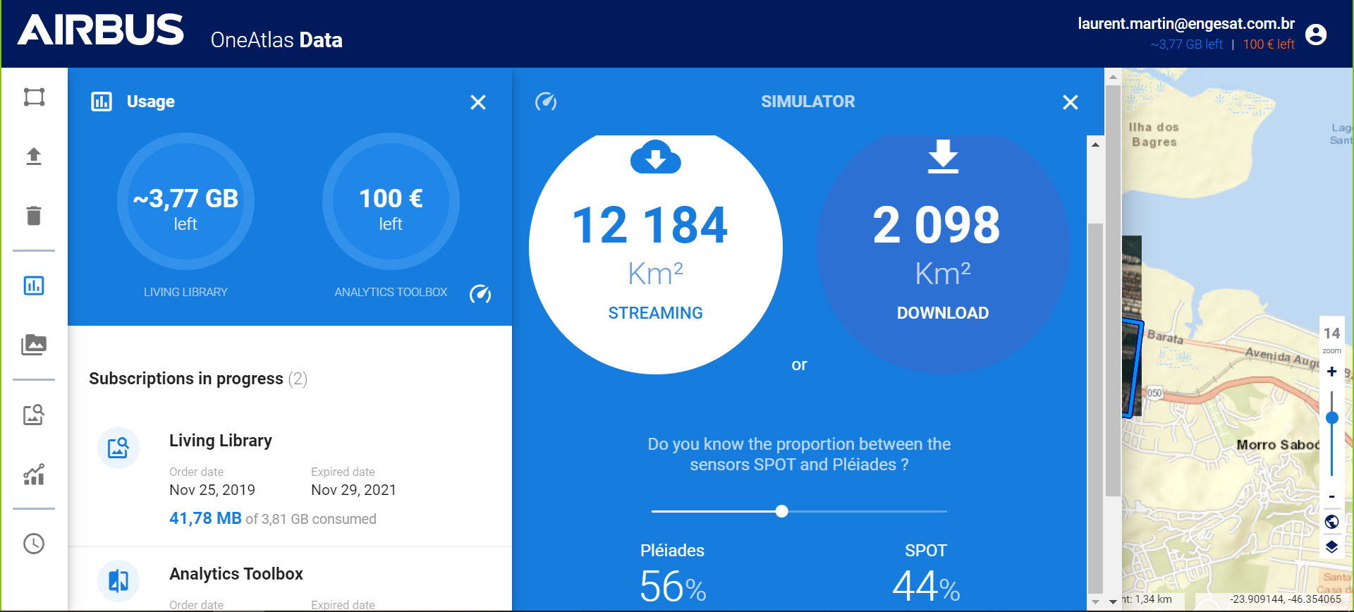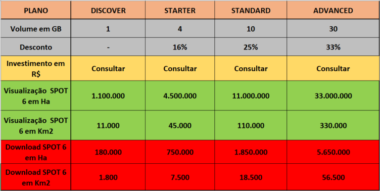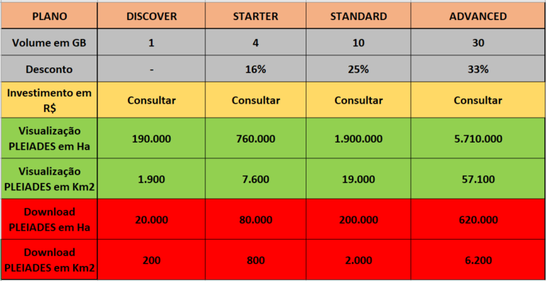 Veja os diferentes planos existentes para assinar o LIVING LIBRARY. Para cada opção de assinatura, corresponde um exemplo de quantidade de Km2 ou de MB de dados, seja PLEIADES ou SPOT. Consulte no e-mail laurent.martin@engesat.com.br ou cel / whatsapp + 55 41 99134 0990 para receber uma proposta comercial.