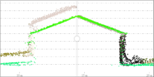 Pontos como estes, que representam o telhado de uma edificação, podem ser selecionados e reclassificados manualmente na visualização de Perfil de Caminho (Path Profile).
