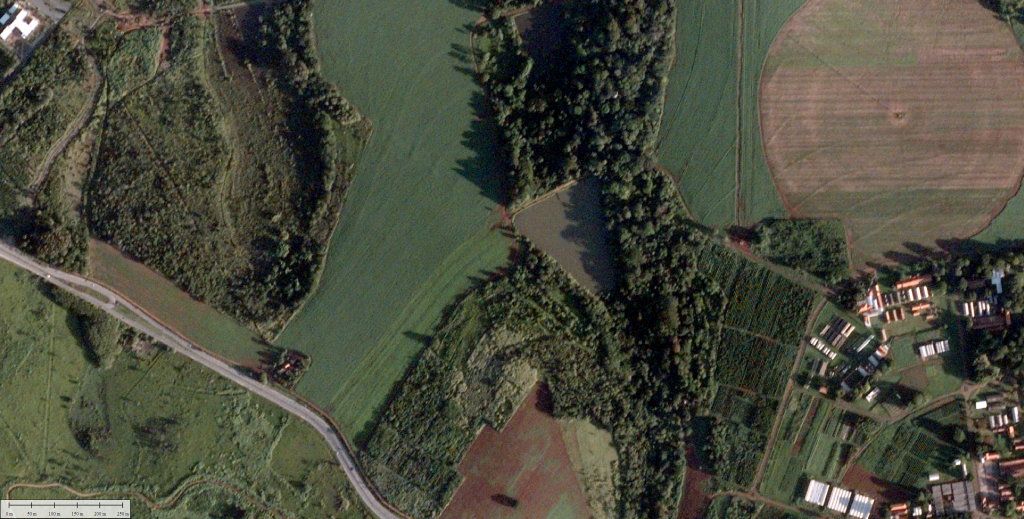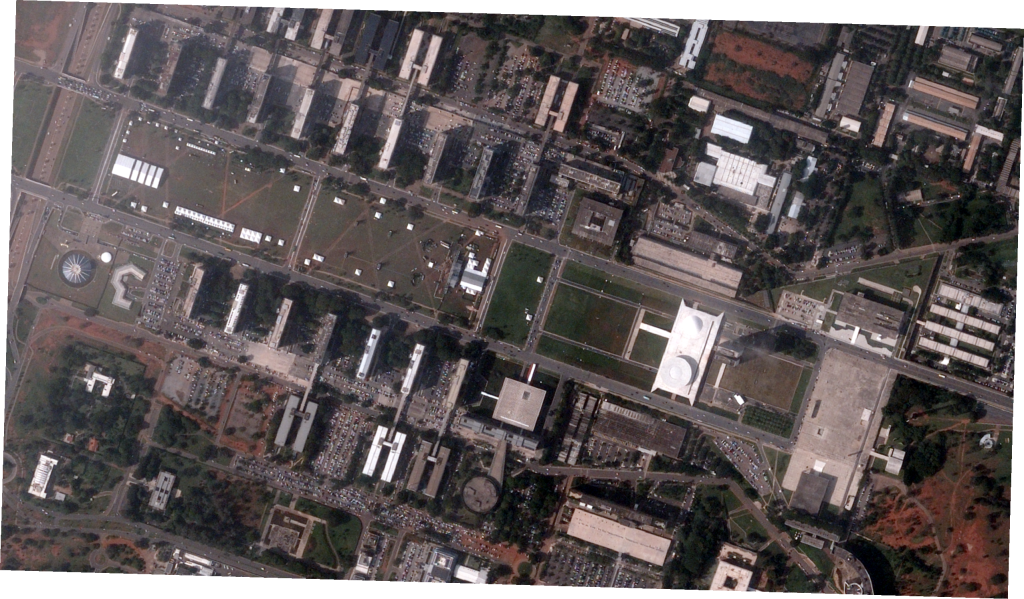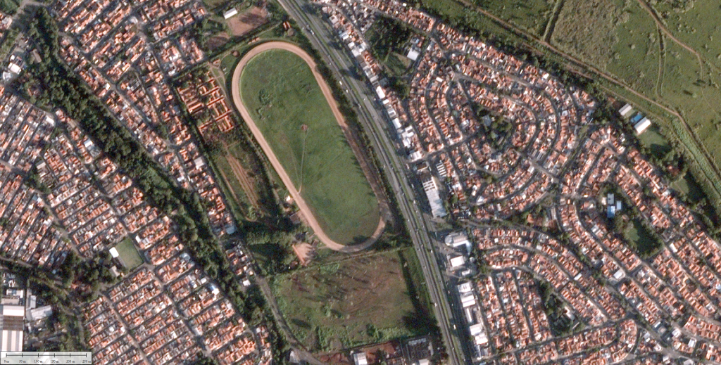 de 83 cm a 1.3 m,conforme o satélite e a configuração e geometria de imageamento. Imagens reamostradas a 80 cm ou 1 m para padronização.