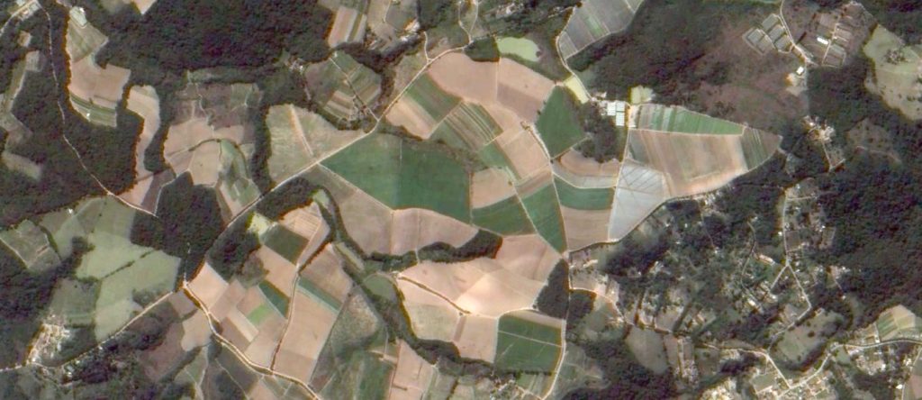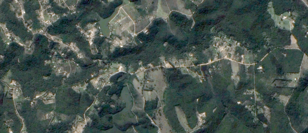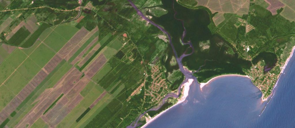 Pancromático P&B; Multiespectral: Azul, Verde, Vermelho e Infravermelho próximo. Elaboração por processamento da fusão PSM de 2,0 m colorido e 4 bandas espectrais.