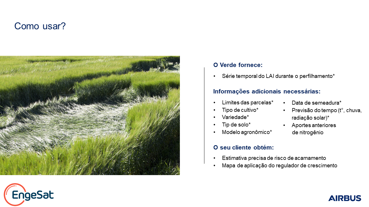 O VERDE é um algoritmo (uma fórmula matemática com inúmeras variáveis) que permite estudar a bomassa da vegetação agrícola. A contratação do VERDE pode se dar de várias formas que explicitamos a seguir. É importante entender o conceito pois o VERDE é um mix de dados e serviços contratados por um período e para fornecer parâmetros biofísicos que o cliente escolhe. A comercialização se inicia no inicio de Maio 2019 segundo as últimas previsões da AIRBUS.