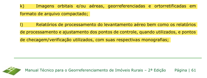 Imagens de satélites de alta e altíssima resolução podem ser usadas nos projetos de Georreferenciamento de Imóveis Rurais, conforme a Manual de Normas Técnicas para Georreferenciamento de Imóveis Rurais - 1ª Edição - 2013 e Manual de Normas Técnicas para Georreferenciamento de Imóveis Rurais - 2ª Edição - 2022, publicada pelo INCRA.