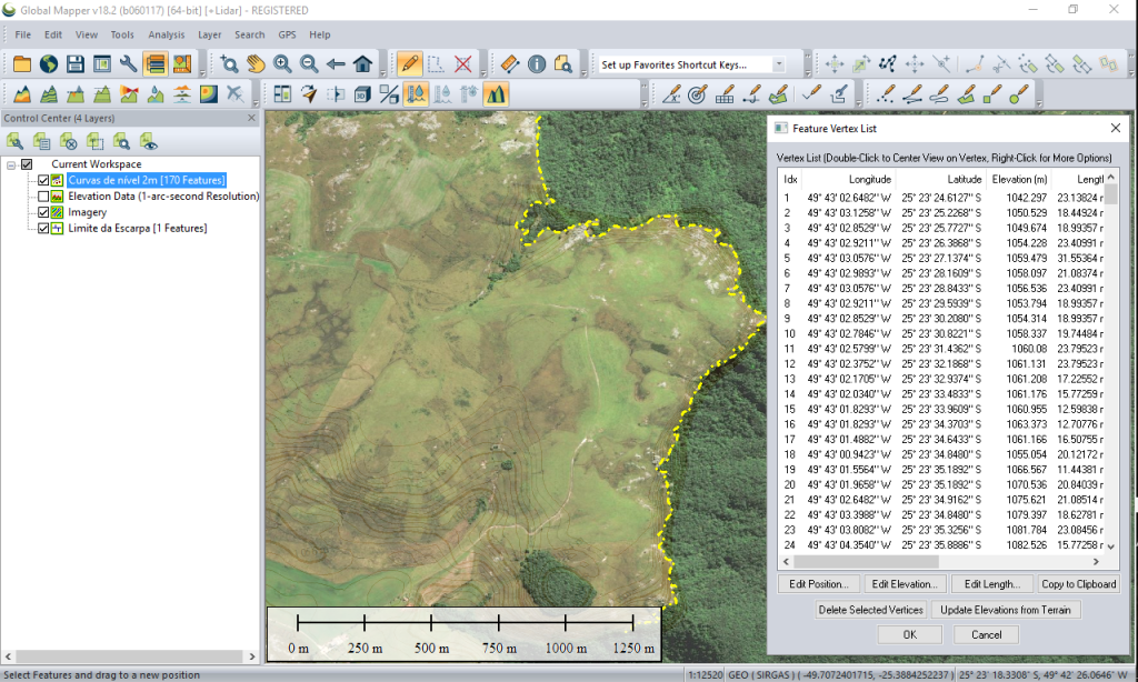 Coordenadas planimétricas e altimétricas registradas em campo;