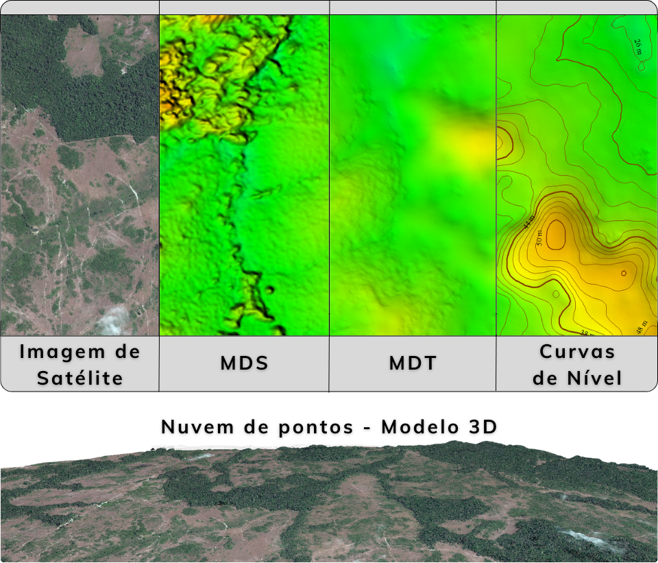 Produtos altimétricos como Modelos Digitais de Superfície (MDS) e de Terreno (MDT) com resolução espacial de 5 metros, além de curvas de nível com equidistância de 2 metros, ideais para aplicações em processamentos altimétricos de alta precisão.