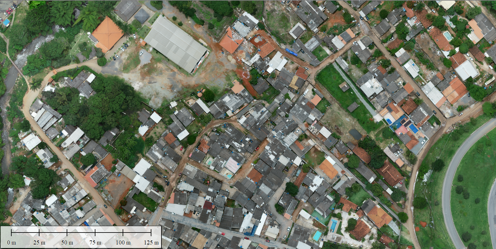 - Ortoimagem: Foto aérea corrigida e alinhada, com medidas reais da área.