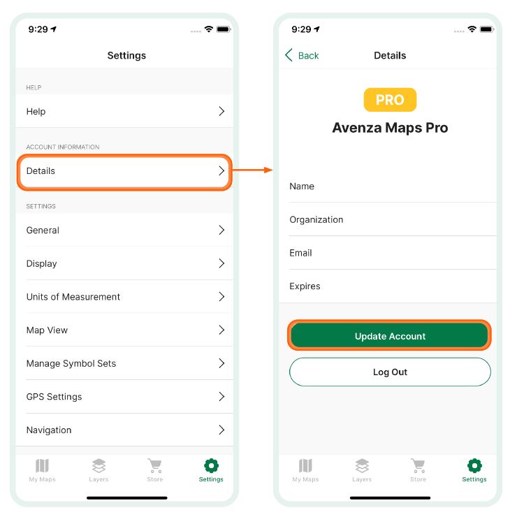 Vá para Avenza Maps > Configurações > Detalhes > Atualizar conta.