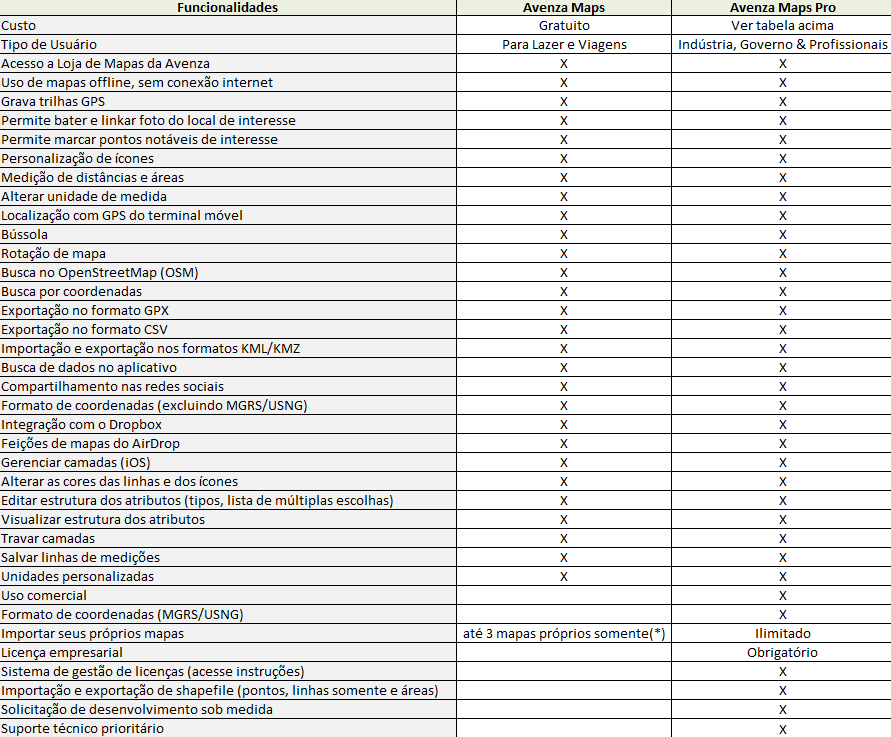 Se você está indeciso quanto a versão do Avenza Maps que se adéqua a sua situação, esta tabela irá lhe ajudar, bem como para atualizar sua versão gratuita para a versão Pro que oferece mais funcionalidades. Segue uma listagem das funcionalidades de cada versão.