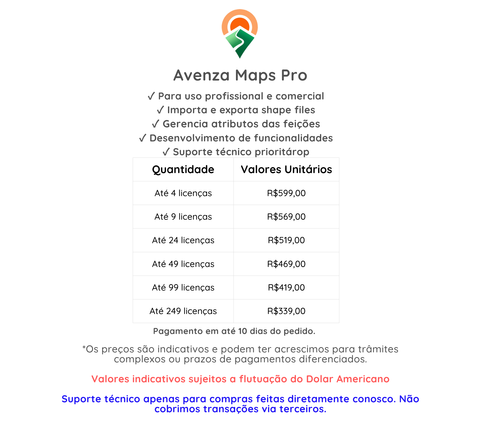 O Avenza Maps é promovido no mercado Brasileiro pela ENGESAT, e sua Parceira Comercial, a Empresa “LAM INFORMÁTICA LTDA” é DISTRIBUIDORA EXCLUSIVA da Avenza Inc. no Brasil, conforme declaração elaborada pela ABES em 01/04/2025 que pode ser acessada no link acima. A comercialização do AVENZA MAP é realizada na forma de assinaturas anuais.
