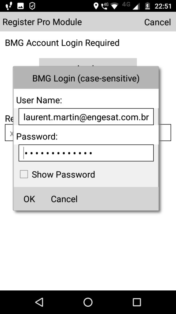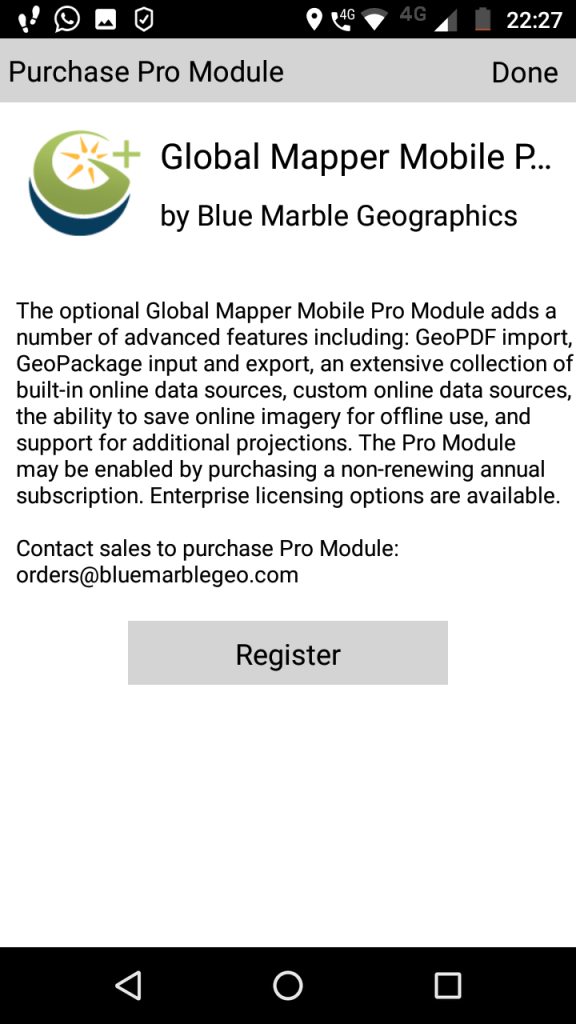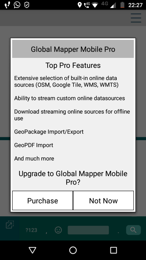 Veja as etapas para instalar o GLOBAL MAPPER MOBILE PRO no seu celular, tendo o GLOBAL MAPPER MOBILE na versão gratuita já baixada e instalada. Clique em cada tela para ver uma ampliação.