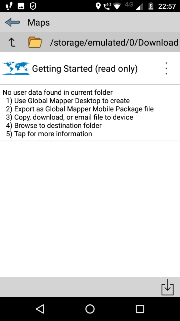 O uso de serviços e dados online é obviamente limitado para as áreas com internet ou acesso a dados. Para situações que requerem a permanência em locais sem estes acessos, o Global Mapper Mobile Pro oferece a opção de baixar e armazenar os dados baixados, para uma área de interesse num arquivo local no terminal móvel.