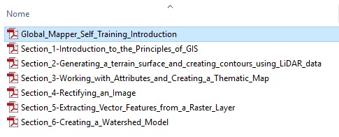 • Acesse o SELF-TRAINING do Global Mapper em inglês, que oferece 6 capítulos sobre as diferentes funcionalidades do GLOBAL MAPPER. Veja algumas ilustrações sobre o conteúdo desta apostila que vem com dados e exercício a serem realizados